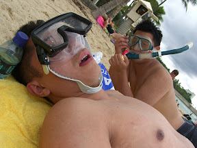 So here's me and trev's snorkel gear... trev lost his snorkel gear when i told him to sit up on the wall where the waves were crashing on to... him and i were just chilling up there while the girls were sunbathing and then POW... we get demolished by a huge wave... and trev loses grip on his snorkel gear... and we spent a good (and VERY exhausting hour) trying to find it... it wasn't until i stood up on a wall and looked into the water did i find it... and when i did i yelled out TREV!!!!!!!!! and belly flopped into the water before it got swept away again... that was for YOU mang!!!
