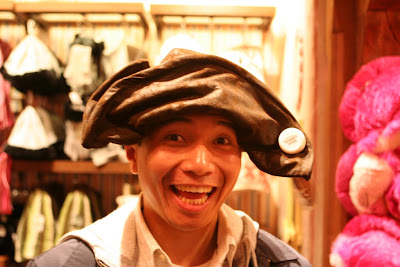 we arrive at the mad hatter and i find a tri-corn pirate hat and decide to put it on... i wore it the way the pirates wore it... with the pointy side facing forward.... trev takes a look at me and goes:
